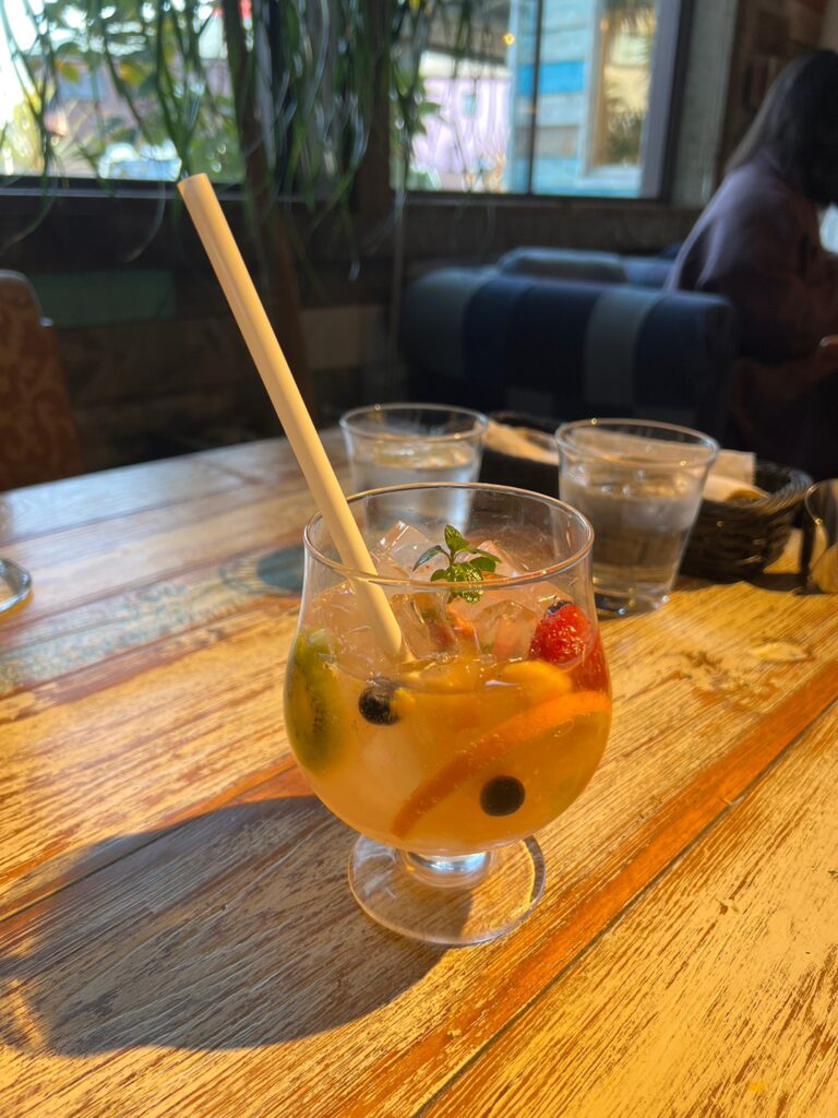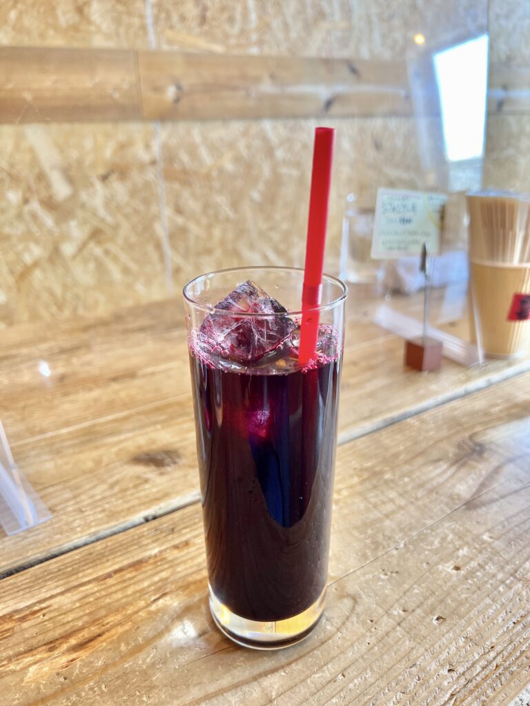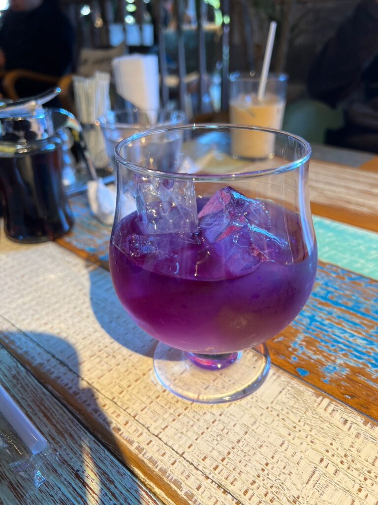 運ばれてきたときはコバルトブルーのジュースですが、定員さんが目の前でレモンシロップをかけると、赤紫に変化します。