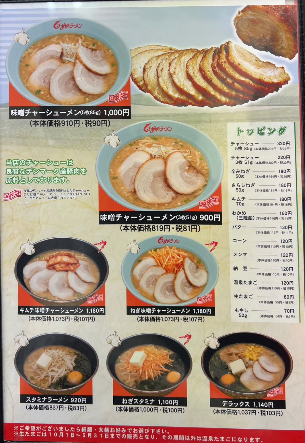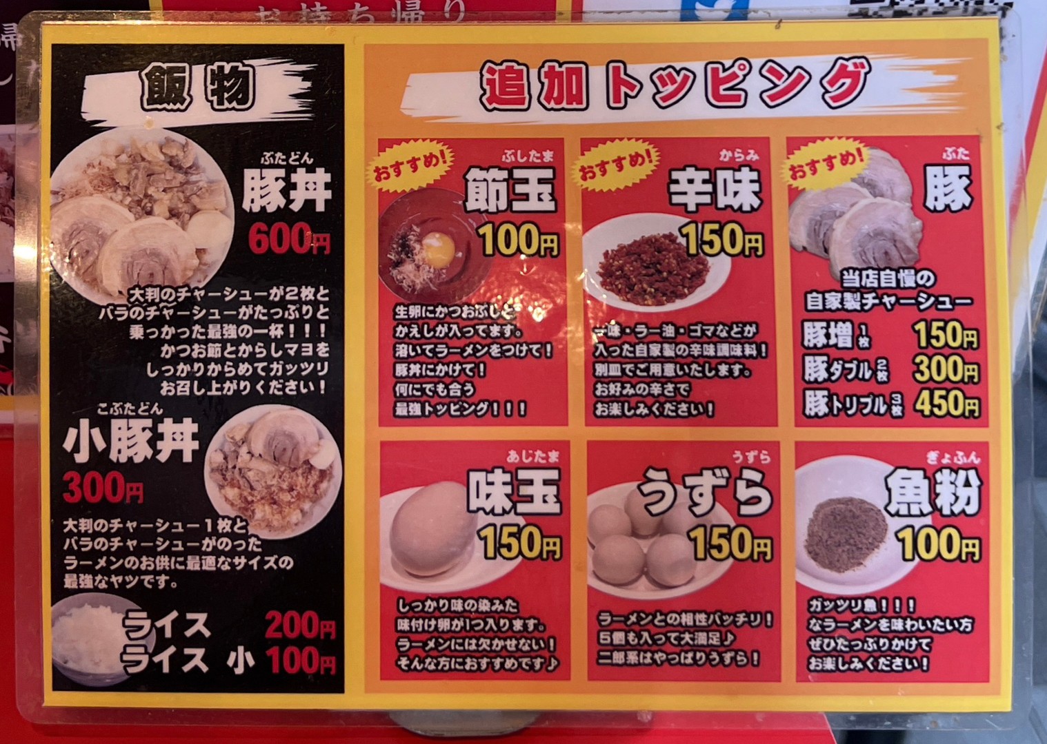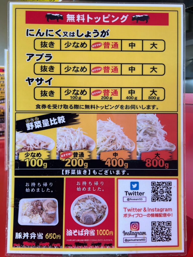 にんにく又はしょうが、アブラ、ヤサイは無料でトッピングを選べます。